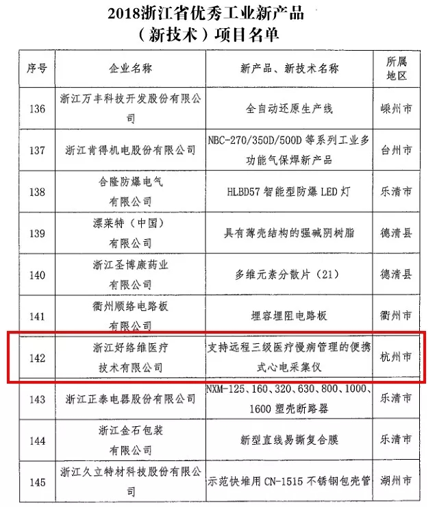 好絡維憑借卓越的技術研發能力以及在智慧醫療行業內的深厚結累,又一項新產品“支持遠程三級醫療慢病管理的便攜式心電采集儀(TE-9000Y)”成功入選2018年浙江省優秀工業新產品(新技術)項目名單,并榮獲三等獎。