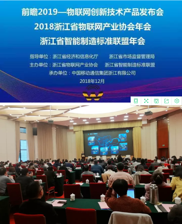 12月19日,前瞻2019——物聯網創新技術產品發布會暨浙江省物聯網產業協會及浙江省智能制造標準聯盟年會在杭州之江飯店盛大舉行。浙江省經信廳副廳長凌云、技裝處處長李永偉、浙江省物聯網產業協會理事長陳宗年等領導及300多位會員老總代表參加會議。