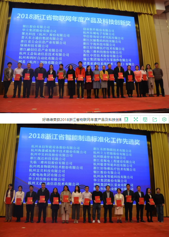 其中,在浙江省物聯網產業年度表彰儀式上,浙江好絡維醫療技術有限公司榮獲“2018浙江省物聯網年度產品及科技創新獎”、“2018年浙江省智能制造標準化工作先進獎”兩項大獎。這是對好絡維在智慧醫療領域做出的努力與工作給予的積極肯定,也表明了好絡維在產品創新上又一次實現了突破。