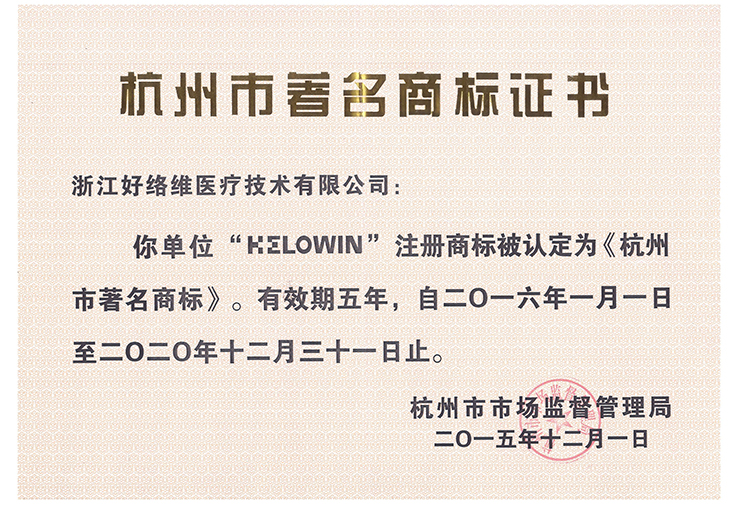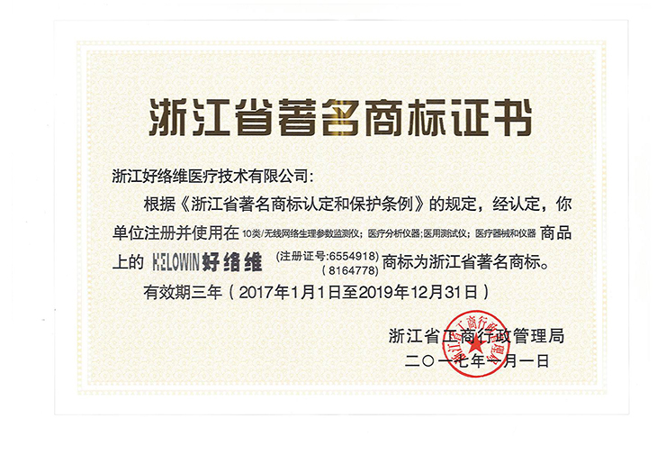 浙江省著名商標(biāo)證書(有效期至2019年12月31)